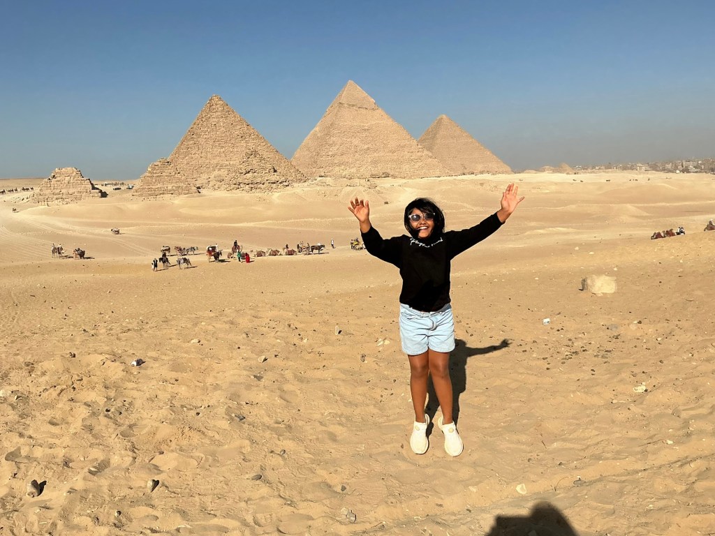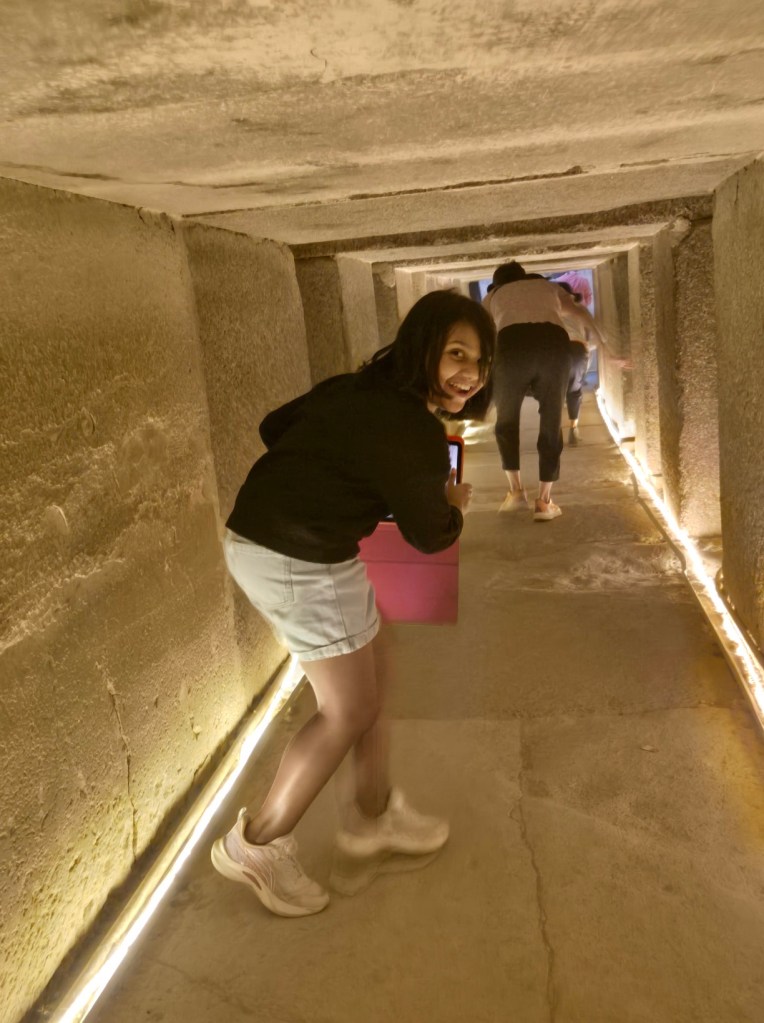 Have you seen the Great Pyramids of Giza in person? Well, if not, this blog is going to take you there. Before I reached the pyramids of Giza, I visited another pyramid called Saqqara also known as the step pyramid which was built before the pyramids of Giza. Earlier, our guide had told us to go inside another pyramid nearby to Saqqara, called pyramid Unas. I was looking forward to this, imagining myself walking chamber to chamber seeing all of the objects that once belonged to a living person. But I was wrong. To enter the pyramid, I needed to bent down a bit as the entrance was very steep and narrow. But I got a closer look at the walls and was surprised that the whole pyramid is made of granite. As soon as I got to the end, I saw a room with walls full of hieroglyphics. I could read some of them, as I have learned about them at school. There was also another room where I saw a tomb. Luckily, there was no mummy in it. It was just one empty tomb. I thought of becoming an archaeologist when I grow up, but then, I remembered that every mummy has a curse within them. So, I stopped thinking about it. There was also a bad, musty smell in the pyramid, but I figured out that it must be because of the long time it has stood in the desert.