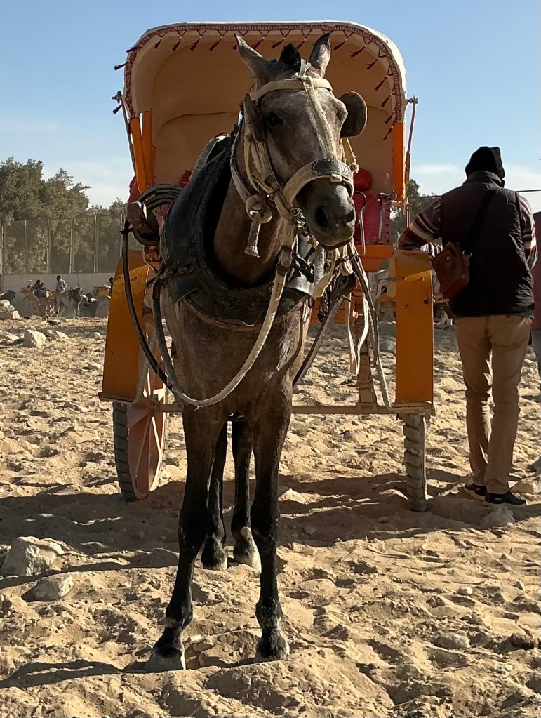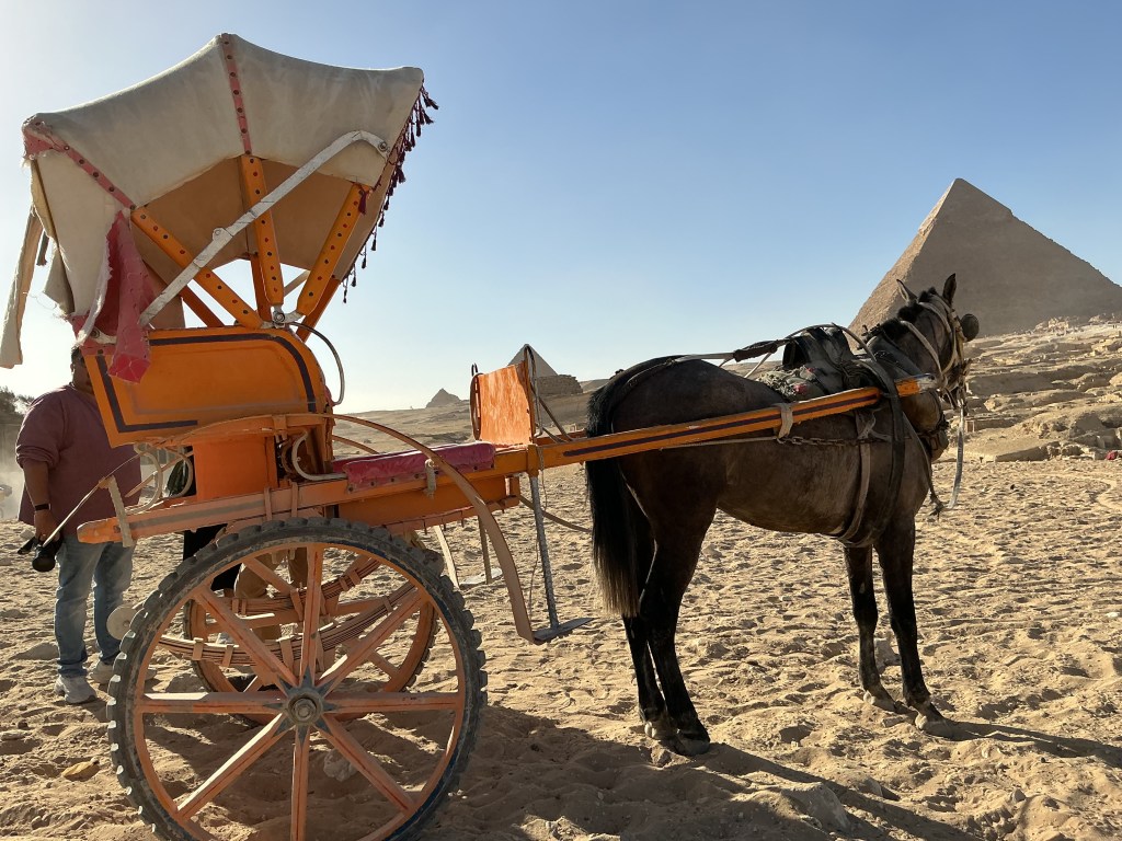 As soon as we entered the gate to the pyramids of Giza, we saw a horse stable. Nearby, I saw a camel stable too. There was a man who is a trip agent and he took us to a room and closed the door. In the room, there was a map stuck to the wall. He explained in detailed about the three types of trips to us – small, medium, and large. In the small trip, we can see 1 of the pyramids of Giza and the Sphinx. For the medium, 3 of the pyramids of Giza, the Sphinx and its temple. For the large, 9 of the pyramids of Giza, the Sphinx, its temple, tombs, and a mountain with a beautiful view of the 9 pyramids of Giza. We had to choose one of these trips and pay for it. We didn’t have time because we had to visit the Great Egyptian Museum after this, but that’s another story! Anyways, we only had about 1 hour so we had to think hard. While we were talking about it, the man said that we can pay the medium price and he will give us the large trip. He also said that if we don’t have time then he can do the trip quickly and make it 1 hour. It was the best offer he could give, so we took it. Next, we had to choose our transport. The options were, horse, camel, or a carriage. Since my parents were not comfortable with riding on a horse or a camel, we took the carriage. At first, the horse was running very fast and it was a very bumpy ride. After few minutes, it started stopping then and there because the poor horse was tired.